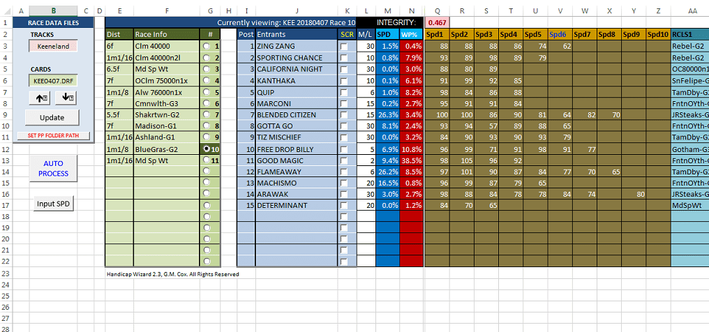 As of today, April 14, 2018, the newest version of Pro-Handicap Wizard, Version 2.3, is available for sale and download. The version now works with BRIS single data files, where the importing and processing of race data is done automatically. Scratched horses can be selected on the interface for non-consideration by the program. The ROI sheet has been expanded to include multi-horse win wagering. The number of entrants has been expanded to 20, making the program applicable to the Kentucky Derby field.