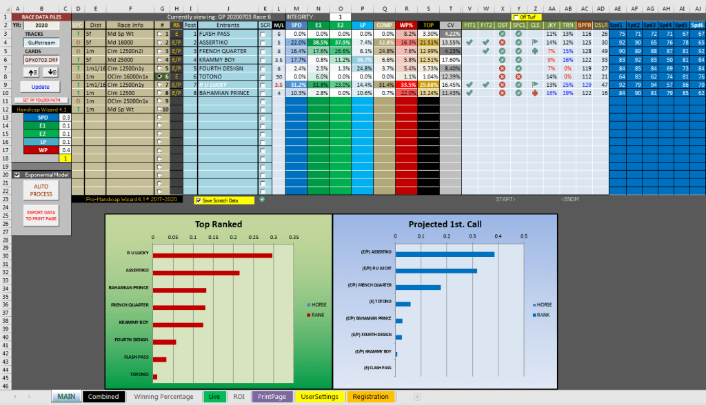 Here is an example of how PHW 4.1 Grey can be used to achieve a successful handicapping outcome in finding the true favorite in a race. In race 3 at Belmont, a $16K claiming race for three-year-olds at 6f, there were essentially two favorites in #1 Wayne’s Footsteps at 3-1 and #6 Cobble Hill at 5-2. The total win probabilities of both were around 20%, with Wayne’s Footsteps having a slightly higher one due to a superior Winning Percentage of 19%. However, upon closer inspection of the PP data, there was a red flag for Wayne’s Footsteps, in that the horse had not run a race for 156 days, with the last time being at Aqueduct, while Cobble Hill finished 1st in his last in a $20K maiden race at Belmont two weeks ago. Consequently, it could be construed that Cobble Hill was in good form, whereas there were questions about Wayne’s Footstep’s form coming off the long layoff and with lackluster works in-between. Moreover, Cobble Hill had the edge in jockey and trainer win percentage at 14% and 26%. As a result, Cobble Hill was clearly the better pick this race, who also had an advantage in LP with a 54% win estimate, which propelled the horse down the stretch in a no-contest win.