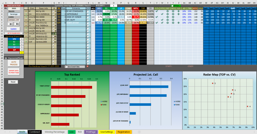 Here are the projections for today’s $750K G1 Whitney Stakes at Saratoga, run at 1 1/8 mi. on the dirt for four-year-olds and up. The program’s top selection is #5 Tom’s D’etat with a 27% win probability, who is also the M/L and Brisnet favorite in the race. Tom’s D’etat has won his last four races, most recently the G2 Stephen Foster at the same distance at Churchill on Jun 27, when he beat #1 By My Standards by four lengths. Tom’s D’etat has an advantage in SPD with a 43.7% win probability according to the simulation while also having the highest COMP estimate at 48.9%. The second selection is #1 By My Standards with a 22.6% win probability, who like Tom’s D’etat, is coming into the race in good form after recording a career high final speed figure in his last race. Of these two horses, only Tom’s D’etat has experience at Saratoga with a win in the $100K Alydar on Aug 2, 2019 and a fourth place finish in the Woodward on Aug 31, 2019. The third choice is #3 Code of Honor, who, despite not rating as well according to the simulation with a 4.7% SPD estimate, has the highest winning percentage in the field at 35.7%. Code of Honor was a winner in the 1 1/16 mi. Westchester on June 6 at Belmont. Previously, he won the Travers, Dwyer and Fountain of Youth in 2019. Of note, Code of Honor has the highest LP estimate in the field at 36%, but he will need to be quicker earlier on to compete with Tom’s D’etat, who rates well in all phases of the race. Bob Baffert trained #2 Improbable likewise comes into the race in solid form after a win in the 1 1/4 mi. Gold Cup on Jun. 6 at Santa Anita, in which he beat Higher Power by three lengths. Improbable ranks third best by final speed, but is behind the other horses as far as winning percentage at 15.3%. Considering recent form, Tom’s D’etat, By My Standards and Improbable appear to be the strongest contenders in that order, but Code of Honor should not be discounted as the winning-est horse and the one with the highest LP estimate. Additionally, his rider, John Velazquez, has won the Whitney Stakes four times.