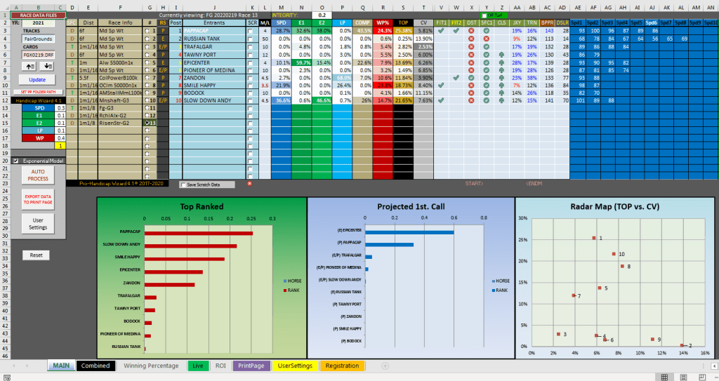 Today at Oaklawn is the $1 mil. G2 Rebel Stakes, run at 1 1/16 mi. on the dirt for three-year olds. The race features morning line favorite Newgrange at 9/5, who is undefeated in three races after winning the Southwest Stakes at Oaklawn on Jan. 29 with a time of 1:45 and 4. The only other graded stakes winners are Kavod in post one, who won the $150K Advent over 6f at the beginning of December and Dash Attack, winner of the Smarty Jones at Oaklawn on Jan. 1 but who finished a distant 5th in the Southwest. The Handicapwizard is favoring #2 Newgrange in this race, who appears to be a typical classic horse. In the simulation projections, he was the only horse that showed strength over E1, E2 and LP, while indicating first in final speed with a 42.8% win probability and first in winning percentage at 33.1%. Versus a total win probability of 29.97%, Newgrange is fairly valued at 9/5 on the M/L. Next is #9 Barber Road with a total win probability of 17.1% versus a 9/2 M/L, again fairly valued. Barber Road projects 2nd in final speed at 33.1%, but is more than twice as risky as Newgrange with a Coefficient of Variance of 12.21%. Third is #1 Kavod, who will be on the pace today with dominant projections in E1 and E2 of 47.5% and 39.5%. But the horse faltered down the stretch in his last race in the Southwest, which was the same distance as today’s Rebel. #7 Ben Diesel, as the fourth selection, looks comparable to Kavod on paper, having strength in early speed but weak in late speed. This race should be a handicapper’s delight with long prices on horses like #8 Chasing Time at 8-1 on the M/L and #10 Ethereal Road at 12-1. Winning his last time out in an $80 OC at Oaklawn in mid January, there is a lot to like about Chasing Time, who is a son of Not This Time along with Epicenter—the winner of the Risen Star last Saturday. Despite his opening fractions being on the slow side, Chasing Time did not need to do more early on in his last race and turned it on when it counted down the stretch to finish with a 96 LP reading, only behind Ethereal Road overall, who had a 105 LP in his last. Trainer, Steve Asmussen, said of Chasing Time a few days ago that his horse has a lot of talent, albeit is on the youthful side, and has trained very impressively in his three works since the $80K OC at Oaklawn in mid January. On the other hand, Ethereal Road is a Secretariat type of horse, slow in the early going but with dominant late speed, projecting at 47% win probability against the field in LP. The question for Ethereal Road is whether he will be able to catch up to the field in time for his big move, which didn’t seem to be a problem in this last race, a $84K maiden claimer at Oaklawn at the end of January, when he won impressively by four lengths despite a sluggish start. In the final analysis, this race is a case where the speed figures and the math projections are not telling the whole story, although the model is always a good starting point. The handicapper needs to know when to deviate from the quantitative projections, when other factors stand out. The final selections are Newgrange, Barber Road, Kavod and Ben Diesel, which, except for Kavod, is the order in according to the M/L odds. However, while I am comfortable with Newgrange as a first selection, I believe either Chasing Time or Ethereal Road could have an upset today and I would be choosing those three horses for the exacta.