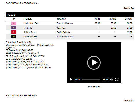 The Handicap Wizard had a nice result today in the 9th race at Oaklawn, a $20K claiming race for fillies and mares three-years old and up. #8 Uncle Mo’s Cat was the first selection with a total win probability of 24.7% versus final odds of 9-5. The horse projected 1st in final speed at 53.7% and had relatively low risk with a Coefficient of Variance of 8.7%. The progam’s second selection was #5 Alpine Ghost at 39-1 with a total win probability of 14.61%. The third selection was #10 Mo Betta at 9-1 with a total win probability of 13.03%, thanks to having the highest winning percentage in the field at 24.4%. As it turned out, Uncle Mo’s Cat was a winner by two lengths over #10 Mo Better, who came up along the rail for 2nd to beat #1 Strike at Beat at 7-2. Uncle Mo’s Cat paid $5.60 to win, while a $1 ex. box with 8, 5, 10 paid $24.80. This race shows the value of the Handicap Wizard’s approach of using both simulation and historical performance, that Mo Better’s high winning percentage factored heavily to make it a 3rd selection, even though the horse had only a 3.9% win probability according to the final speed projection in the simulation.