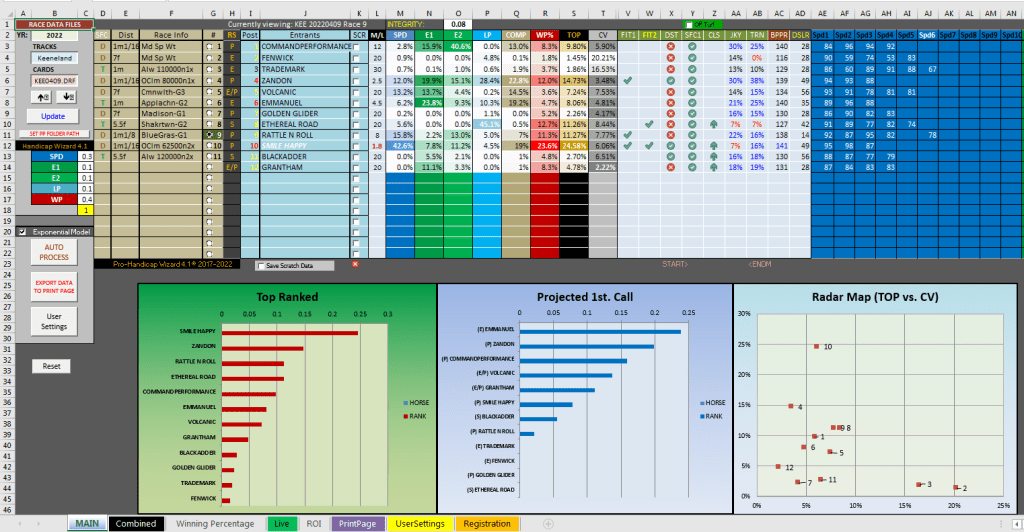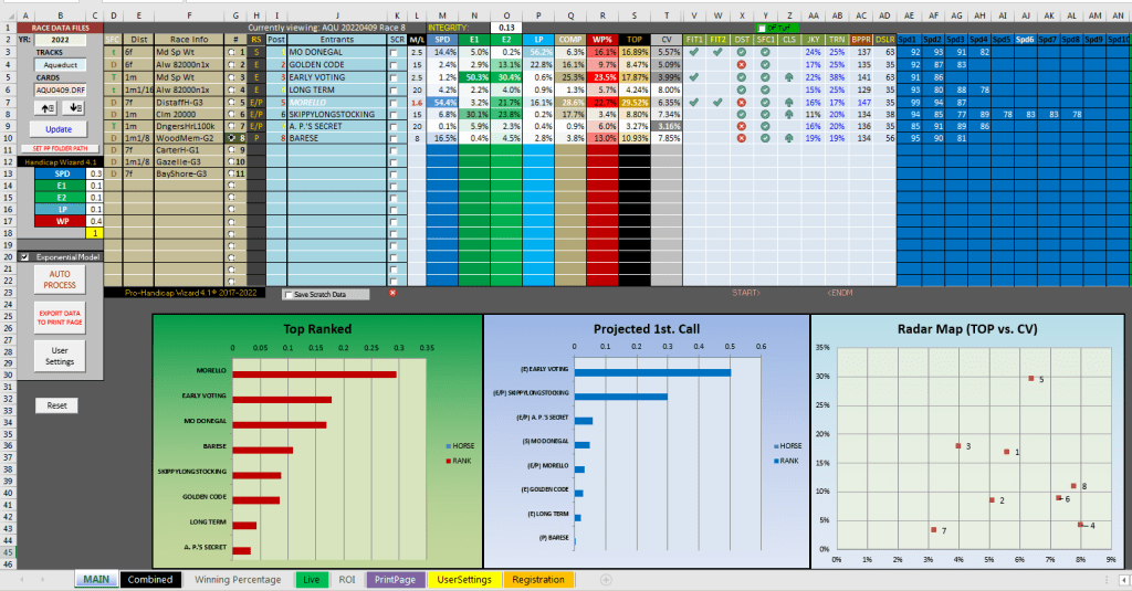 Today at Aqueduct is the $750K G2 Wood Memorial, run at 1 1/8 mi. on the dirt for three-year olds. The race features several graded stakes winners, including Morello, who won the Gotham at Aqueduct in March by four lengths. Others are Mo Donegal, winner of the Remsen at Aqueduct in Dec., as well as Early Voting, winner of the Withers at Aqueduct in early Feb., and Barese, who like Morello is undefeated in three starts after winning the Gander at Aqueduct in Feb. and the Rego Park at Aqueduct in January. The Handicapwizard has #5 Morello as its first selection with a total win probability of 29.52% versus 7-5 on the morning line. Morello projects first in final speed at 54.4% and has the second highest win percentage at 22.7% after Early Voting at 23.5%. Second is #3 Early Voting with a 17.87% total win probability, who projects well in E1 and E2 at 50.3% and 30.5%, while having a COMP value of 25.3%. Third is #1 Mo Donegal at 16.89% total win probability, who projects third in final speed at 14.4% but first in LP at 56.2%, for which he has a FIT2 checkmark along with Morello. Fourth is #8 Barese with a 10.93% total win probability, who projects second in final speed at 16.5%. In the final analysis, Morello does appear to be a solid first selection, who is also undefeated in three starts. The one question about Morello is how well he will be able to handle the distance, given that the longest he has gone is 1 mi. in the Gotham, which he won by four lengths. Projecting dominantly in LP, Mo Donegal should pose a challenge down the stretch along with Golden Code, who ranks second in LP at 22.8% while having progressed in each of his three starts. It will be interesting to see how Early Voting does on the pace and whether he can steal the race from Morello, if left unchallenged early on. It’s worth nothing that Early Noting projects nearly as well as Morello in COMP at 25.3%. The final selections are #5 Morello, #3 Early Voting, #1 Mo Donegal and #8 Barese.