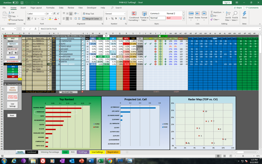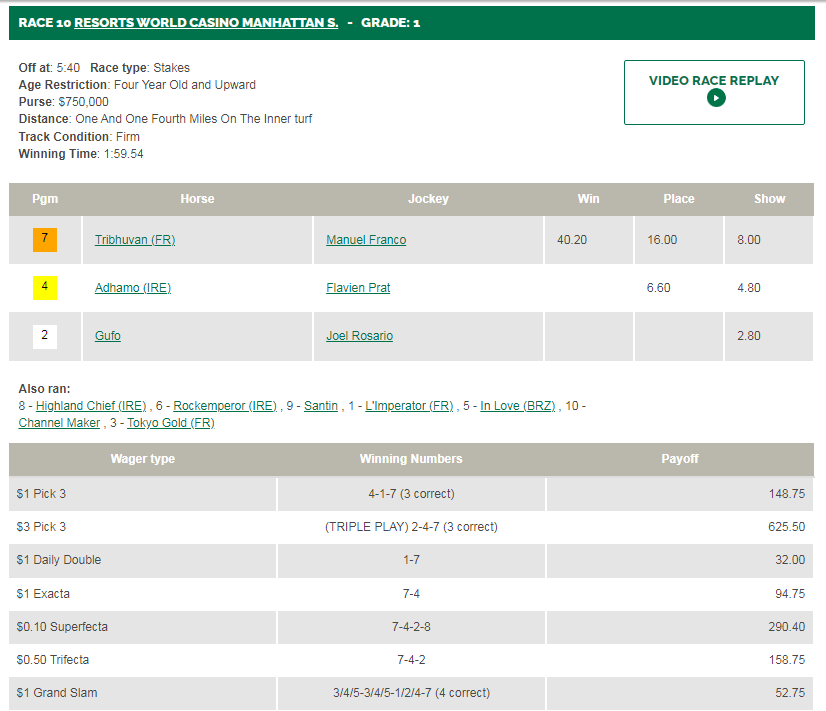 The Handicap Wizard turf program had a nice result yesterday in the 10th race at Belmont, the G1 Manhattan, Stakes, run at 1 1/4 mi. on the turf for four-year olds and up. The program’s second selection was #7 Tribhuvan (FR), who had a total win probability of 17.36%. The horse’s fair value was around 5-1 compared to final odds of 19. The horse projected dominantly in E1 and E2 with win estimates of 72.0% and 60.9%. Although the horse had a final speed estimate of only 1.7% due to having fallen out of form, the COMP value of 40.3% signaled about 6-5 strength for the horse on the component level in the aggregate according to the simulation. As the program predicted, Tribhuvan went to the lead and held on to win impressively by four lengths. The COMP was key because of the horse’s low risk with a Coefficient of Variance of 7.58%. The horse paid $40.20 for the win. This handicapper did have Tribhuvan to show.