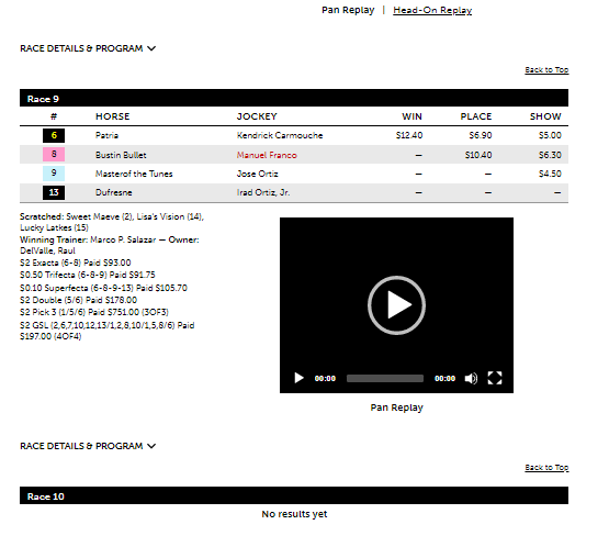 In another race at Aqueduct, this time in the 9th, which was a $75K allowance race on the turf at 6f for three year olds, the Turf Program had the winner with its first selection of #5 Patria at 5-1 with a total win probability of 35.32%. Here the program solved Patria to be the best horse in the simulation, as one can see in the E1 and E2 win estimates of of 100% and a COMP value of 99%. The data profile is unquestionably dominating. In the race, the horse went out an early lead and went on to win by a length. It was too good to be true, yet it was true that Patria had a 2-1 odds equivalent valuation by the program and still went off at a big price at 5-1. This race is an example of where the horse really liked the turf, as indicative from the single superior data point on turf. Such data could only be captured with the Turf Program, which excluded Patria’s results on dirt, which were not stellar.