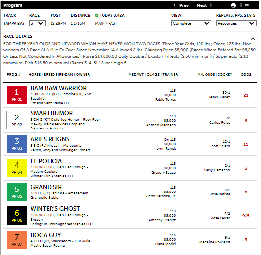 The Handicapwizard Grey Version had the winner with its first selection, #6 Winter’s Ghost, in the 3rd race at Tampa, a $8K claiming race at 1 1/16 mi. on the dirt for three-year olds. The horse went off at 9-5, but there were indications in the data like with its SPD, LP and COMP estimates of 78.4%, 50.1% and 72.3% that the horse’s true value was some where between 2-5 and 1-1. With such dominating projections, Winter’s Ghost sailed to victory in easy fashion, winning by nine-lengths.