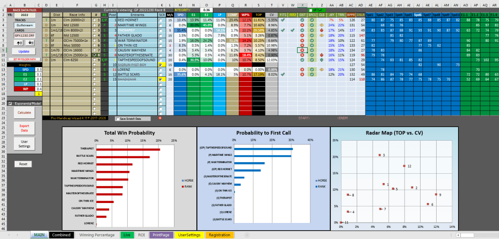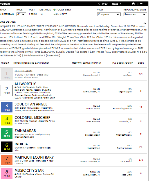The Handicap Wizard had the winner with its first selection in the first graded stakes race at Gulfstream today in the 6th, the $125 Rampart Stakes, which was run at 1 mi. on the dirt for three year filles and mares. #7 Maryquitecontrary had the highest win probability at 26.8% versus final odds of 9/5, which made her a slight overlay. Maryquitecontray had the highest LP projection at 88.2%, which showed around the far turn with the horse surging from last to first. By win percentage at 24% the horse had a 3-1 fair value and had low risk with a Coefficient of Variance of just 3.68%. Marquitecontrary paid $5.80 for the win.