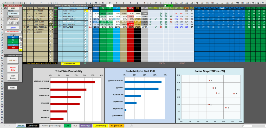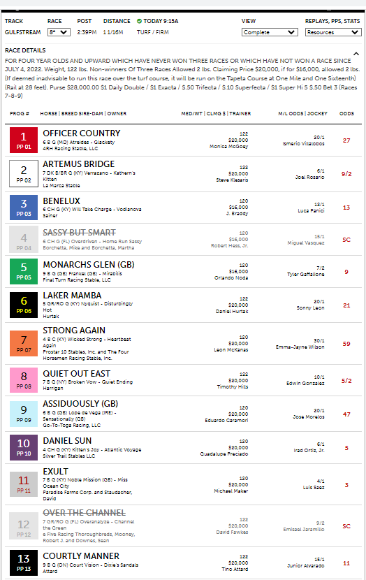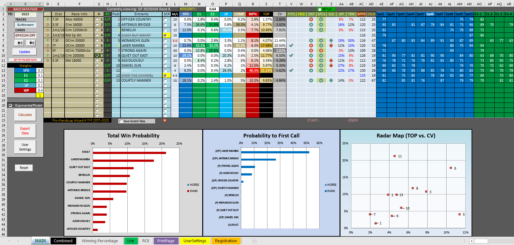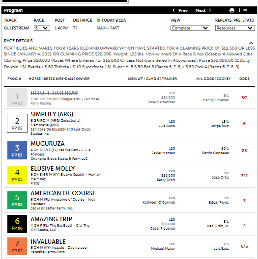 There was an excellent result for the Turf program at Gulfstream today, this time in the 8th, a $20K claiming race at 1 1/16 mi. on the turf for four-year olds. The program had the order of the exacta reversed, which had a huge payout because of the second selection, #6 Laker Mamba, winning at 21-1. #11 Exult was the first selection with a win probability of 21.21%. Laker Mamba was not too far behind at 17.68% win probability. What was notable among the metrics was Laker Mamba’s dominant E1 and E2 projections (52.1% and 32.2%) and high COMP value at 43.3%, where the horse was projecting at 6-5 in terms of the components in the simulation in the aggregate. The race went largely according to the projections, with Laker Mamba setting the pace with his speed, who by the quarter pole had built such a lead that he was able to sail home. Exult was the class in this race with a win percentage of 40.3%, who held true to his class by finishing second. The $2 exacta with 6,11 paid $237.80. This handicapper is kicking himself for this being the one that got away.
