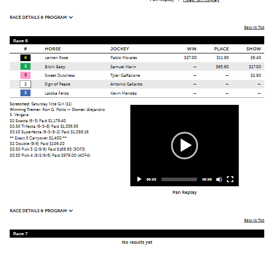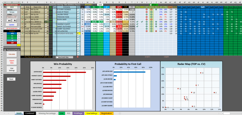 The PHW Turf program had an excellent result today in the 6th race at Tampa, a $28K allowance race at 1 1/16 mi. on the turf for fillies and mares four-years-old and up. #6 Lenten Rose was the first selection with a total win probability of 26%, making the horse an overlay (3-1) relative to the M/L of 5-1. However, the horse went off at 12-1, representing a big opportunity. Lenten Rose projected best in E1 and E2 with 85.9% and 86.7% win estimates and most importantly in COMP at 66%! (3-5 equivalent fair value) win estimate, indicating the horse projected very favorably versus the field on a component level in the aggregate. Opportunities don’t often come like this, but with the Handicap Wizard you are on top of it. Lenten Rose paid $27 for the win.