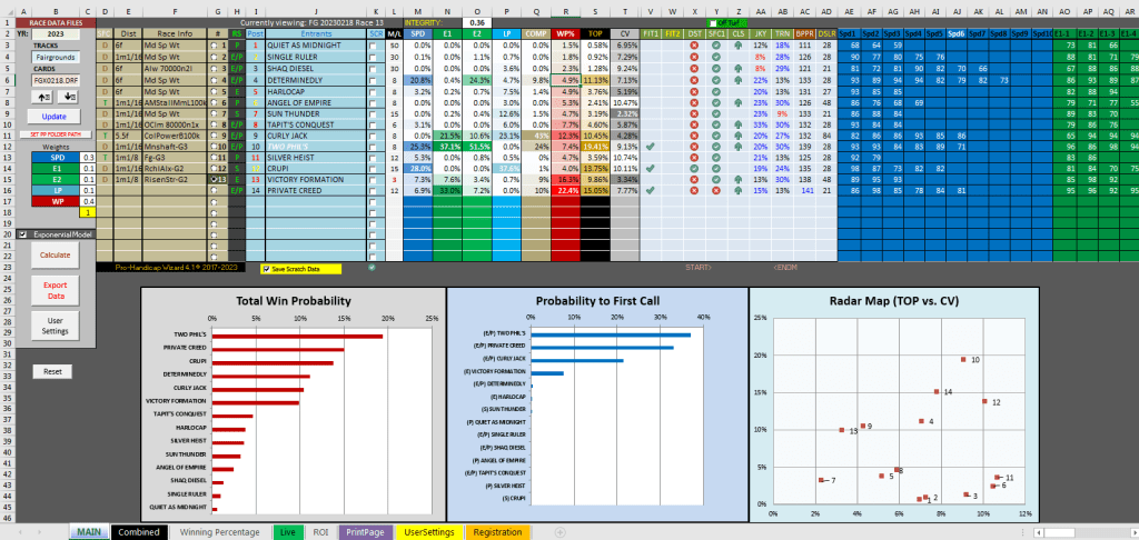 Today at the Fairgrounds is the $400K Risen Star Stakes, run at 1 1/8 mi. on the dirt for three year-olds. The race has several graded stakes winners including #13 Victory Formation, winner of the Smarty Jones at Oaklawn in Jan., #10 Two Phils, winner of the Street Sense Stakes at Churchill at the end of October, and #9 Curly Jack, winner of the Iroquis at Churchill in September and runner-up in the Kentucky Jockey Club at Churchill in Nov. The Handicap Wizard has #10 Two Phil’s as the first selection with a total win probability of 19.41%. Two Phil’s projects 2nd in SPD with a 25.3% win probability and first in E1 and E2 with win estimates of 37.1% and 51.5%. The second selection is #14 Private Creed with a 15.05% total win probability, who is the class in the field with a win percentage of 22.4%. Third is #12 Crupi with a total win probability of 13.75%, who projects first in SPD at 28% but with a Coefficient of Variance of 10.11%, representing slightly elevated risk. And fourth is #4 Determinedly with a total win probability of 11.13%, who projects 3rd in SPD with a 20.8% win estimate. Breading down the numbers, Two Phil’s has value at 8-1 both according to total win probability and his final speed projection of 25.3%, where his fair value by that metric is closer to 3-1. That said, his LP projection of 0% is concerning when this race is at 1 1/8 mi. and he only has the 4th best win percentage at 7.4%, putting his fair value according to that metric around 12-1. On the other hand, Private Creed has class in terms of win percentage as a 3-1 horse but is being discounted in the M/L because of his drop-off in form in the last race. Curly Jack is interesting because of his high COMP value of 43%, which may be distorted by the variance of his individual components like E1 in simulation, whose fair value is 8-1 according to win percentage of coming in 2nd in the Kentucky Jockey Club at Churchill at the end of November, when he recording an LP value of 103. He has not raced since then but seems to have had decent workouts in February. In the final analysis, there is value with Two Phils, Determinedly and Crupi according to the final speed projections from the simulation, while Private Creed has value according to win percentage and Curly Jack according to COMP. #8 Tapit’s Conquest could be interesting in this spot as a Brad Cox horse, who today will be ridden by Florent Geroux, but he lost to Determinedly in his last race and otherwise does not have a lot of statistical support for his 8-1 price. The selections are #10 Two Phils, #14 Private Creed and #12 Crupi, and #4 Determinedly.