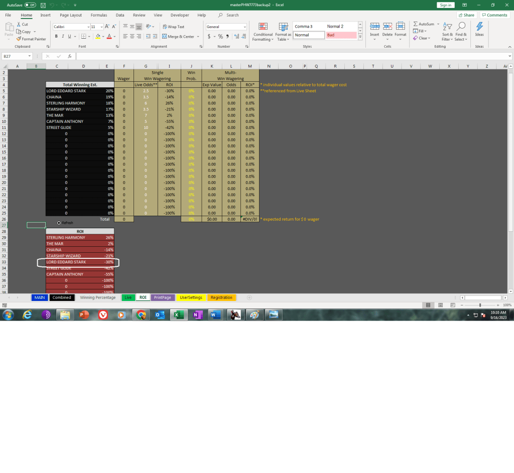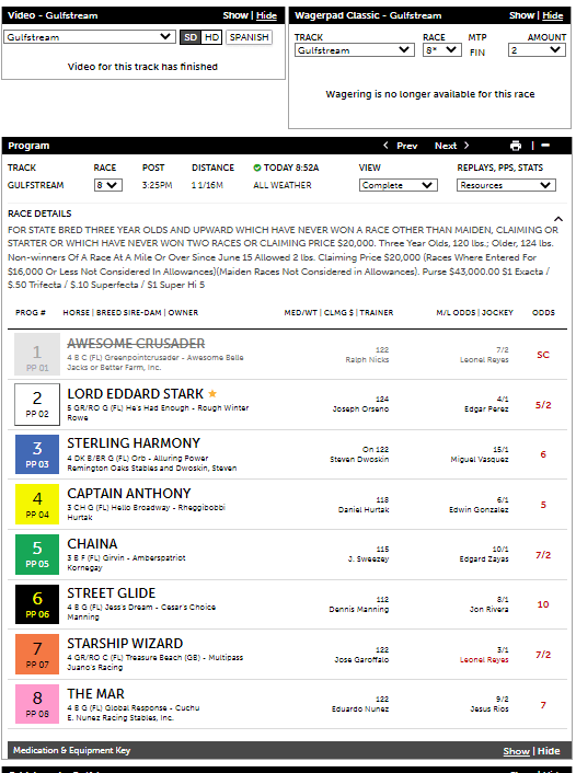 The Grey program had a good result yesterday in the 8th race at Gulfstream, a $20K optional claiming race at 1 1/16 mi. on the dirt for three-year-olds and up. The first selection was #2 Lord Eddard Stark with a total win probability of 20.05% versus final odds of 5-2. At that price that horse was an underlay according to the ROI analysis. Even though the horse won, taking underlays or negative ROI horses is a losing strategy over time. It’s better then to wait for more favorable odds.