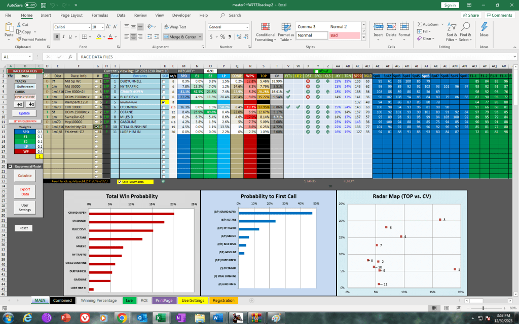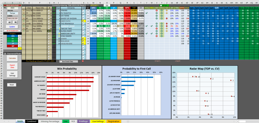 The Handicapwizard had some excellent results yesterday at both Tampa and Gulfstream. In the 9th at Tampa, a $16K handicap at 1 mi. on the turf, the Turf Program had the winner with its first selection in #7 Cannon’s Roar at 17-1. Its total win probability was 16.28%, translating to a fair value of 6-1. The horse had a high COMP at 54.8%, suggesting strength at the component level in the aggregate, as well as the highest win percentage in the field at 13.6%. On the basis of its win percentage alone, Cannon’s Roar was a 7-1 horse but went off at 17-1. This is exactly the kind of setup a handicapper should be looking for in a race in having the first selection be an overlay.