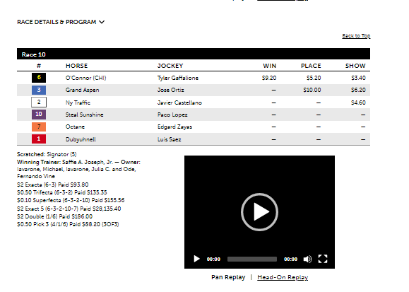 In the G3 Harland’s Holiday in the 10th, the program had the exacta order reversed with its top two selections of #3 Grand Aspen at 7-2 and #6 O’Connor at 10-1. Just before the wire O’Connor surged ahead of Grand Aspen , who had been leading down the stretch. The $2 exacta paid $93.80.
