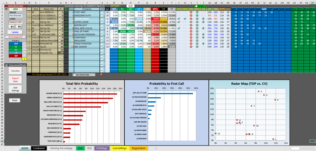 Tomorrow at the Fair Grounds is the $400K G2 Risen Star Stakes, run at 1 1/8 mi. on the dirt for three-year olds. The race features Kentucky Jockey Club winner, #3 Honor Marie, Remsen runner-up, #4 Sierra Leonne, Smarty Jones winner, #8 Catching Freedom, and Lecomte winner, #12 Track Phantom. The program is favoring #3 Honor Marie as its first selection with a total win probability of 18.82%, making it an underlay at 3-1 on the M/L. Honor Marie is the class in the race with a win percentage of 19.65% (4-1 equivalent) and has the third highest SPD win estimate of 23%. The second selection is #4 Sierra Leone with a total win probability of 17.44%. Sierra Leonne has the highest SPD win estimate at 36.3% (2-1 equivalent), though its risk is elevated with a Coefficient of Variance of 9.7%. The third selection is #6 Real Men Violin. The horse has a total win probability of 15.8% compared to its M/L of 8-1. Real Men Violin has the second highest SPD win estimate at 25.7% but has high risk with a CV value of 11.9%. In the final analysis, these horses are all green, like those we saw last week in the Sam F. Davis at Tampa. Honor Marie is sitting in the driver’s seat after winning the Kentucky Jockey Club at Churchill back in late November but Sierra Leone is a serious challender after coming from well off the pace to nearly get the upset against Dornoch in the Remsen in early December. Keep in mind that the total win probabilities of the top two selections are still low at 18.8% and 17.4%, which means that the race is fairly wide open along with there being limited past performance data on these horses.