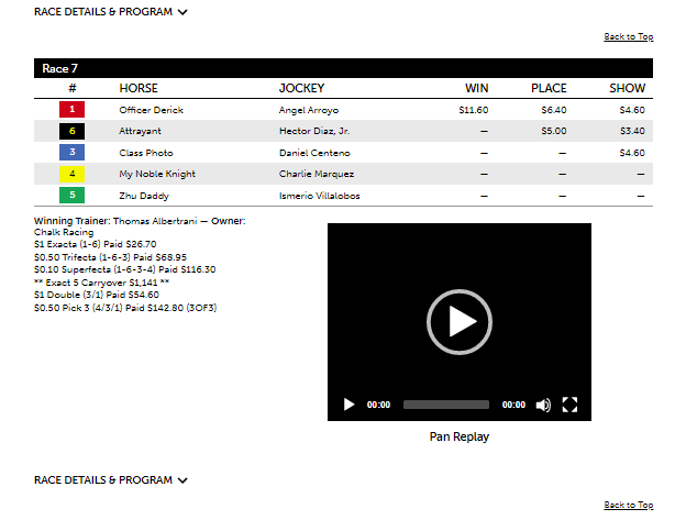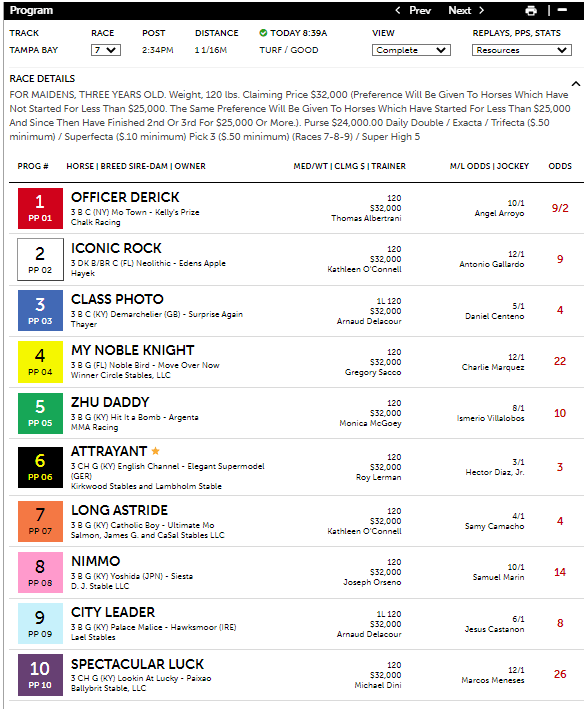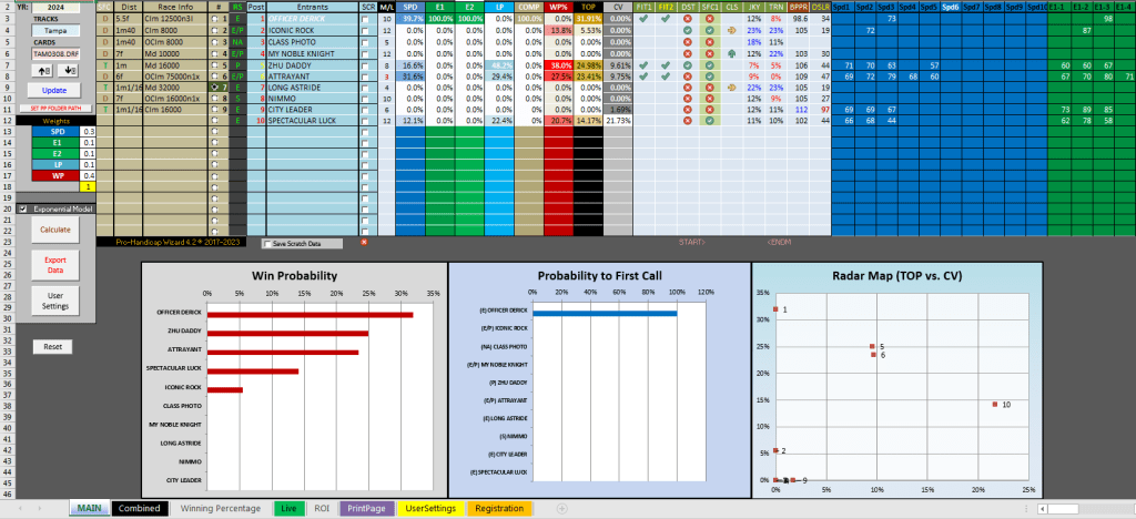 The program had another successful result at Tampa today, this time in a 7th, a $32K maiden claiming race run at 1 1/16 mi. on the turf. The Turf program had #1 Officer Derrick as its first selection with a total win probability of 31.91% (2-1 odds). Even though Officer Derrick did not project as well with the Grey version, which takes into account both dirt and turf data, the horse projected 1st with the Turf version, which processes only turf data. As it turns out, Officer Derrick had the highest final speed figure on turf of all the horses in the field. Besides having a high total win probability, Officer Derrick had a 39.7% final speed estimate (about 7-5 equivalent) and 100% values in E1, E2 and COMP. Only with the Turf version would you have detected the horse was so strong on turf against this field, showing its value in complementing the Grey version as a handicapping tool. Even though there was not a lot of data, the calculations were still correct in pointing to strength with Officer Derrick.