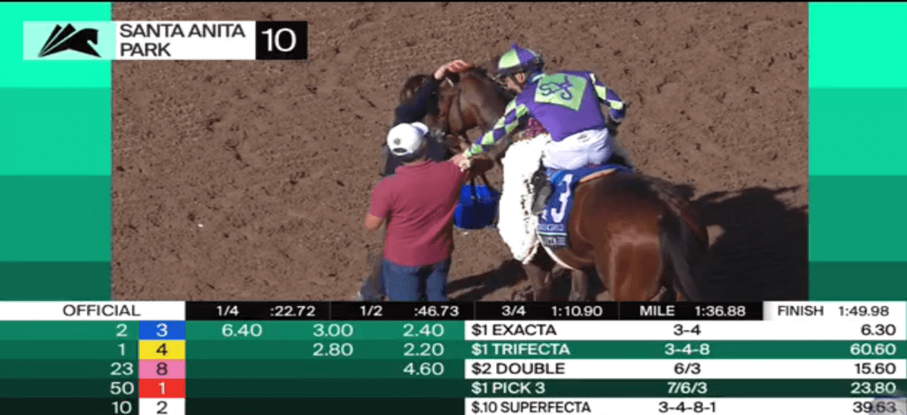 The program had the winner today with its first selection of #3 Stronghold in the $750K G1 Santa Anita Derby. Stronghold had a total win probability of 38.87%, translating to theoretical odds of 8-5. The horse went off a 2-1. In a thrilling finish, Stronghold beat the favorite, Baffert trained #4 Imagination at 1-1, by a nose, who was the third selection with theoretical odds of 5-1.