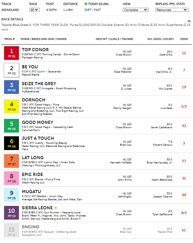 Sierra Leone won the $1 mil. Blue Grass Stakes at Keeneland yesterday, beating Just A Touch by two lengths. Coming out of the far turn, Sierra Leone was about six wide but found his stride down the stretch, accelerating in the final eighth. Sierra Leone was the third selection with theoretical odds of 9-2 compared to final odds of 8-5. The second selection, Just a Touch at 3-1 (7-2 theoretical odds), was leading the race down the stretch until the final sixteenth when he was overtaken by Sierra Leone. As mentioned in the preview, Just a Touch had a very strong COMP figure of 61.5% (4-5 equivalent), indicating that the horse projected very well against the field on a component level (i.e., E1, E2 and LP) in the aggregate in the simulation. Dornoch at 5-2 (7-2 theoretical odds) finished fourth.
