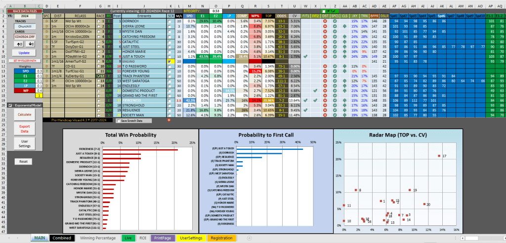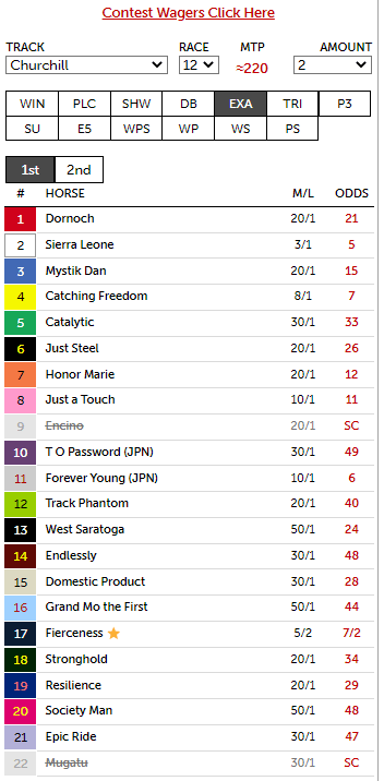 Here are the updated projections for the Kentucky Derby at Churchill after the scratch of #9 Encino. The win probability of #17 Fierceness is up to 20.96%, corresponding to theoretical odds of 7-2. The 7-2 theoretical odds matches exactly where Fierceness is this morning with the live odds. It’s worth noting that the Japanese Horse, #11, Forever Young is down to 6-1 with its odds. 6-1 is where the horse would be on a win percentage basis adjusted for stakes, which is all the data there is on him.