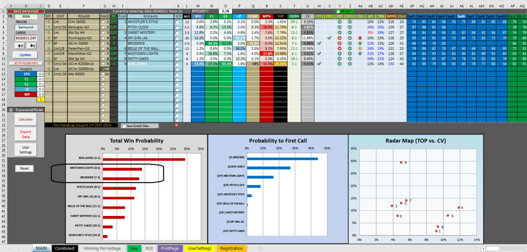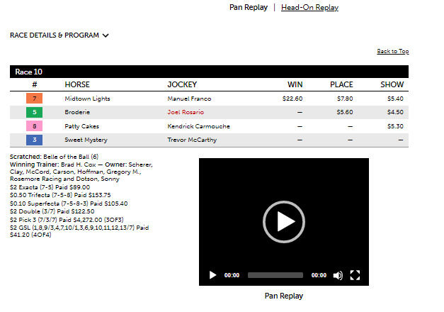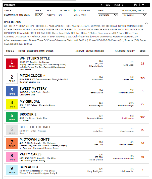 The 10th race at Belmont today had another good result for the program. It had the order of the exacta with its 2nd and 3rd selections in #7 Midtownlights at 10-1 and #5 Broderie at 9-2. Midtownlights was the second selection because of its win percentage of 27.8%, the highest in the field. That equates roughly to 3-1 fair value., indicating the horse was priced at a significant discount at 10-1. Often times, classy horses or horses with high win percentages who have fallen out of form tend to bounce back with a strong performance. This is what happened here with Midtownlights. The favorite #2 Pitchclock at 6-5 was a non-factor as a fourth selection.
