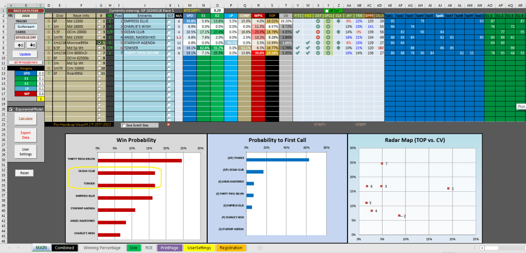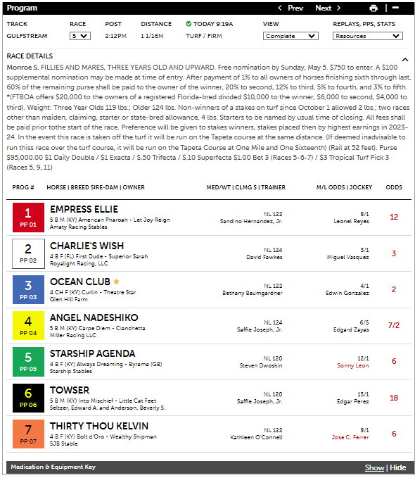The Turf Program had another good result in the 5th race at Gulfstream, the $95K Monroe Stakes, which was run at 1 1/16 mi. on the turf for three-year olds fillies and mares. The program had the exacta horses among its top three selections of #7 Thirty Thou Kevin, #3 Ocean Club and #6 Towser. Thirty Thou Kevin and Ocean Club led until the far turn, when Ocean Club broke ahead. He went on to win over Towser at 18-1, who ran a big race to come in second.