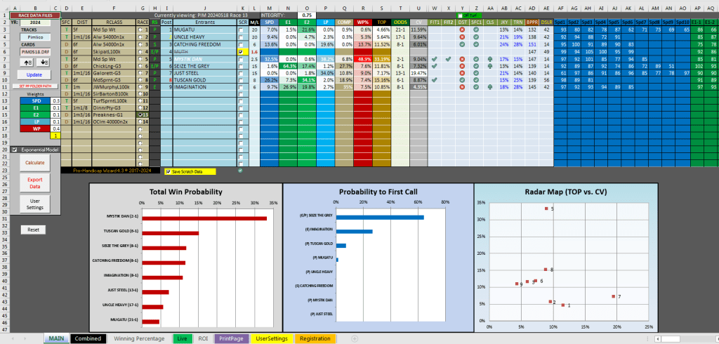 Here are the updated projections for the Preakness after the scratch of #4 Muth. There are several things worth paying attention to now. One is Imagination’s 35% COMP value, indicating 2-1 strength for the horse on component level (i.e., E1, E2 and LP) in the aggregate. Imagination’s odds could well fall in the 3-1 to 5-1 range, if not lower. Seize the Grey’s COMP is also relative high at 27.7%, suggesting 3-1 strength. Tuscan Gold with his 26.2% SPD and 18.9% COMP estimates appears to have 3-1 to 4-1 strength with those metrics versus his 8-1 M/L.