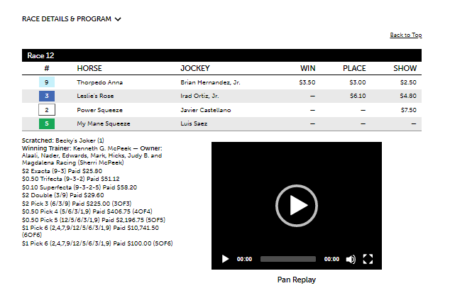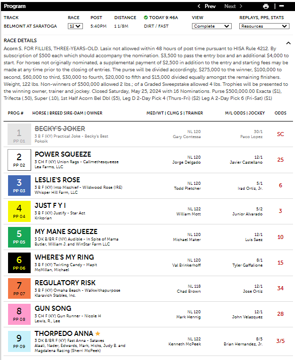 The program had the winner with its first selection of #9 Thorpedo Anna in the finale in the 12th at Saratoga today, the G1 $500K Acorn Stakes. It was run at 1 1/8 mi. on the dirt for three-year old fillies and mares. Thorpedo Anna at 3-5 won by five lengths over the third selection, #3 Leslie Rose at 6-1.