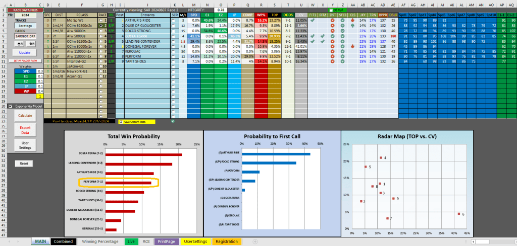 The program had a good result today on the day before the Belmont Stakes in the 2nd race at Saratoga, a $62.5K optional claiming race at 1 1/4 on the dirt for three-year olds. As a fourth selection, Perform #8 had favorable metrics, including theoretical odds of 7-1 versus final odds of 18-1. The horse was being discounted in terms of final speed projections, win percentage and COMP with values of 14.8% (6-1 theoretical odds), 9.9% (9-1 theoretical odds) and 29.0% (3-1 theoretical odds), respectively. It’s strength in COMP with a 29.0% value indicated the horse had 3-1 strength on a speed component level in the aggregate while having average risk with a Coefficient of variance of 8.11%. In the race, Perform chased the favorite, #1 Arthur’s Ride, for most of the race but was able to hold on for place. The place paid $13.00. The race shows how value can be found using not only total win probability, but also the individual metrics, which COMP sticking out as relatively strong.
