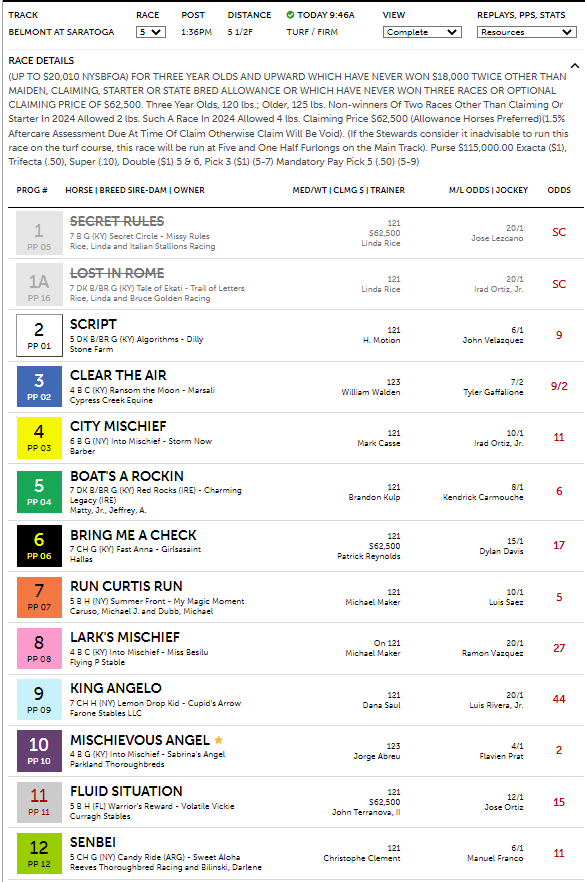 There was a good result for the Turf Program in the 5th race at Saratoga today, which was a $62.5K optional claiming race at 5 1/2 f on the turf for three-year olds. The third selection, #4 Boats a Rockin, was an overlay with a total win probability of 18.02%, converting to theoretical odds of 9-2 versus final odds of the 6-1. Shortly before post, the horse had been 8-1. For a 5 1/2 furlong race, Boats a Rockin projected dynamite in E1 with a 67.6% win estimate while also having favorable COMP (20%) and win percentage 14.7% values that made him attractive in this spot, The horse shot out to the lead and never looked back, holding off a late charge by #7 Run Curtis Run at 6-1. Run Curtis Run was the 1st selection and was also an overlay with theoretical odds of 7-2. Boats a Rockin was preferable in this race because of his superior E1 projection, which suited the 5 1/2 furlong distance. Both horses had the same COMP value and final odds of 6-1.