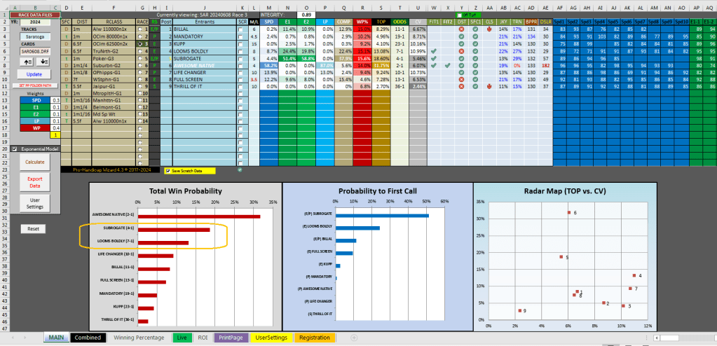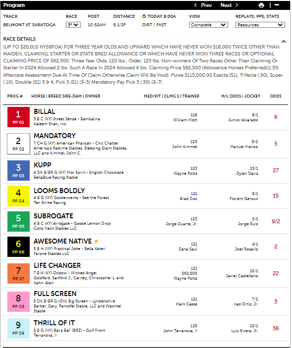 The Turf program had the exacta order reversed with its first and second selections of #2 Arzak at 7-1 and #8 Cogburn at 2-1 in the 9th race at Saratoga, the G1 $500K Jaipur Stakes at 5 1/2 f on the turf for three-year olds. Cogburn led from start to finish while Arzak was able to come up for second. With his win, Cogburn set a course record at 5.5 f. The $2 exacta paid $37.60.