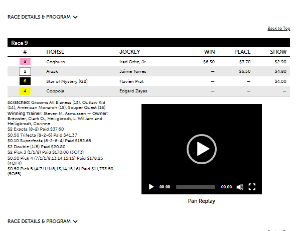 The Turf program had the exacta order reversed with its first and second selections of #2 Arzak at 7-1 and #8 Cogburn at 2-1 in the 9th race at Saratoga, the G1 $500K Jaipur Stakes at 5 1/2 f on the turf for three-year olds. Cogburn led from start to finish while Arzak was able to come up for second. With his win, Cogburn set a course record at 5.5 f. The $2 exacta paid $37.60.