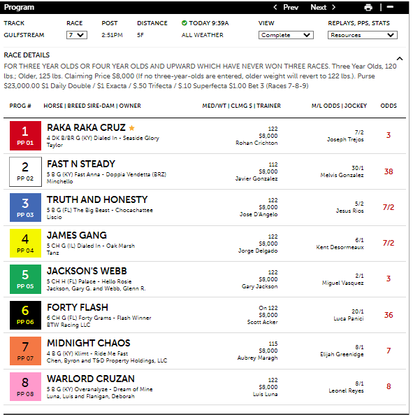Having had some race days cancelled recently due to the extreme heat in South Florida, Gulfstream was back in action today. In race 7, an $8K optional claiming race at 5f, the program had a nice result with its 1st selection of #3 Truth and Honesty, who at 7-2 won over #1 Raka Raka Cruz, which was the third selection at 3-1. Truth and Honesty was valued at 7-2, which is exactly where he went off at. In the race, Raka Raka Cruz was cruising down the final stretch when he was caught by a surging Truth and Honesty at the wire in a photo finish. The race once again shows the accuracy of the odds of the program, with the favorite’s theoretical odds equaling his final odds. Truth and Honesty paid $9.60.