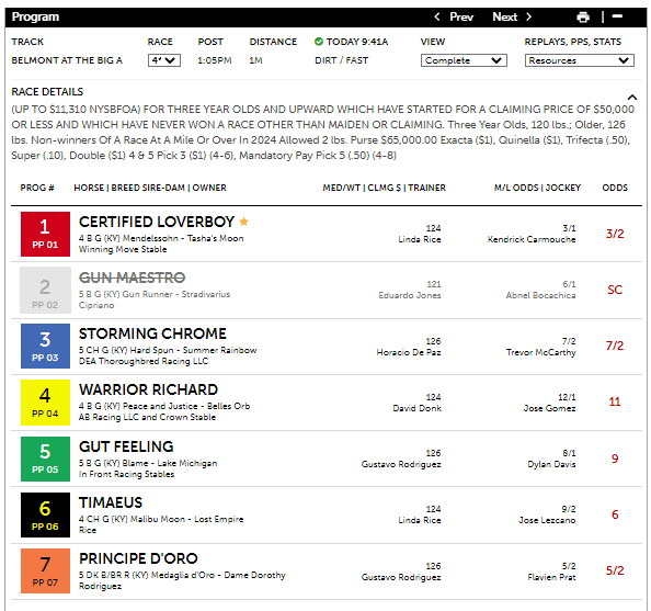 The Turf Program saw a predictable result in the 10th at Belmont at the Big A today, a $150K graded stakes race at 1 mi. on the turf for three-year-old fillies. The program’s first selection was #3 Macanga with theoretical odds of 3-1 versus final odds of 2-1. The horse had a 23.52% total win probability with high E1 and E2 win estimates. The fourth selection and favorite was #9 Oversubscribed with theoretical odds of 6-1 compared to final odds of 1-1. The reason for Oversubscribed being a heavy underlay was that it had put up a high LP figure in its most recent race (106), translating into a LP win estimate of 65.4% in the simulation. This superior value, which triggered the FIT2 checkmark, converts into odds of 3-5, which is below the odds Oversubscribed went off at. In the race, Oversubscribed did not disappoint, where he flew down the stretch upon hitting the quarter mile pole to make up a good ten lengths against Macanga to get the win. Macanga had been a solid choice as well, who nearly held on but had to settle for third.