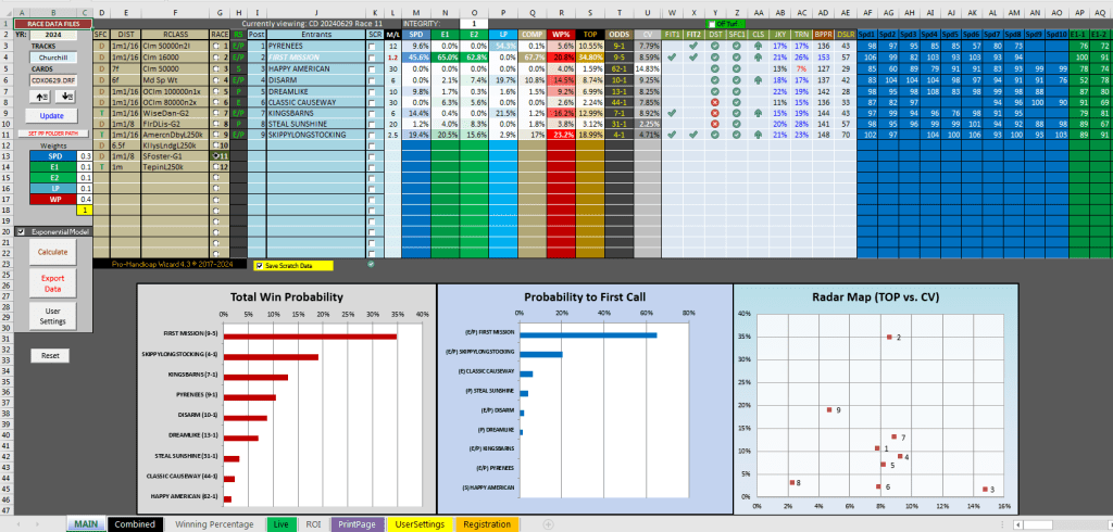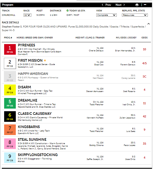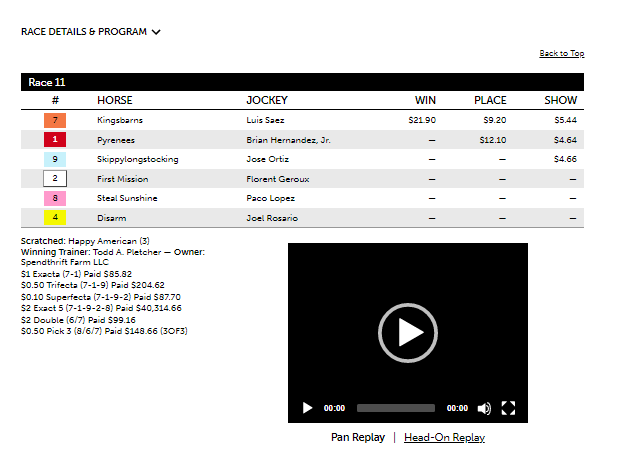 The $1 mil. Stephen Foster Stakes at Churchill saw an interesting result today, with the program’s third selection, #7 Kingsbarn at 9-1 (7-1 theoretical odds), getting the upset over #2 First Mission at 4-5 and #9 Skippylongstocking at 4-1. In the race, First Mission broke out to the lead and Skippylongstocking and Kingsbarn stalked from 2nd and 3rd positions. The order stayed this way until after the half mile point when #4 Disarm at 4-1 began to challenge the leaders on the inside. Then Kingsbarn swooped outside around the far turn and catapulted to the lead down the stretch past First Mission. #1 Pyrenees gained late down the middle of the track but ended up a length behind while Skippylongstocking trailed close to finish 3rd. With odds of 9-1 for Kingsbarn and 10-1 for #1 Pyrenees, the $1 exacta paid $85.82. As a third selection, Kingsbarn was an overlay at 9-1 compared to theoretical odds of 7-1, but it would have been taken shrewd handicapping to find Pyrenees too as the second selection. The horse did project strong late speed with a LP win estimate of 54.3% against the field.