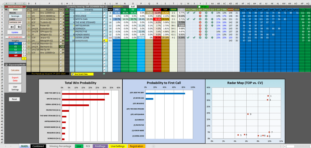 The program had a good result today on the day before the Belmont Stakes in the 2nd race at Saratoga, a $62.5K optional claiming race at 1 1/4 on the dirt for three-year olds. As a fourth selection, Perform #8 had favorable metrics, including theoretical odds of 7-1 versus final odds of 18-1. The horse was being discounted in terms of final speed projections, win percentage and COMP with values of 14.8% (6-1 theoretical odds), 9.9% (9-1 theoretical odds) and 29.0% (3-1 theoretical odds), respectively. It’s strength in COMP with a 29.0% value indicated the horse had 3-1 strength on a speed component level in the aggregate while having average risk with a Coefficient of variance of 8.11%. In the race, Perform chased the favorite, #1 Arthur’s Ride, for most of the race but was able to hold on for place. The place paid $13.00. The race shows how value can be found using not only total win probability, but also the individual metrics, which COMP sticking out as relatively strong.