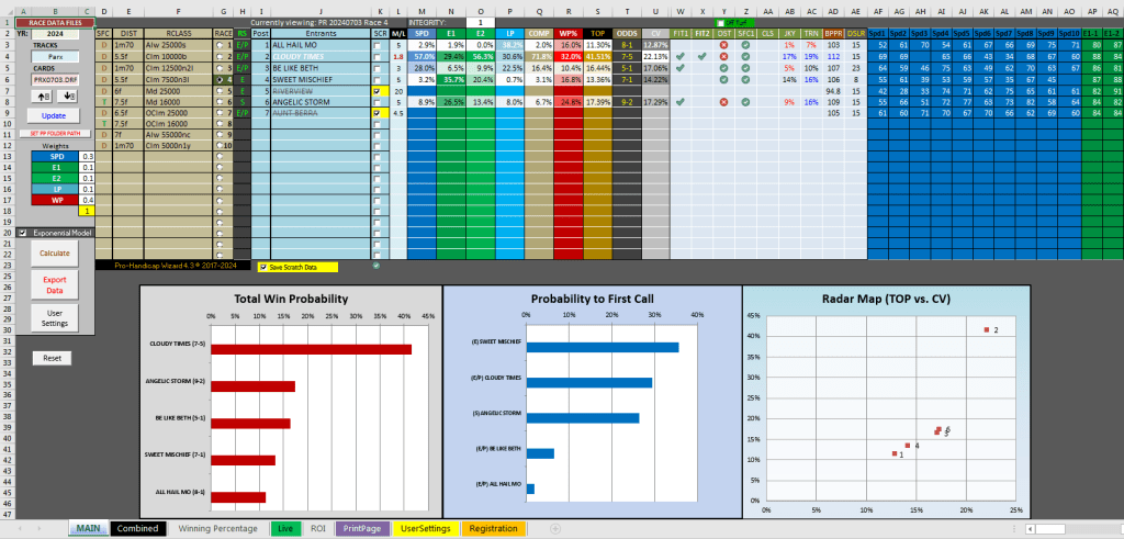 The program had good results today at Parx, including having winners with its first selections in the 2nd #4 Pontiffany), 3rd (#3 Summersattheshore), 4th (#2 Cloudytimes), 7th (#4 Big Dreamer) and 10th races (#4 Teewinot Pass). The first four were “chalk” winners at 5-2 odds or less, but the horse that won in the 10th in #Teewinot Pass was 9-1 compared to theoretical odds of 7-2. This was one time where the horse’s risk actually worked in his favor rather than against him. Teewinot Pass had a SPD win estimate of 32.3% (about 2-1 equivalent) and also a COMP of 45.5%, indicating the horse had about 1-1 strength against the other horses in terms of their speed components in the aggregate. However, Teewinot Pass had a CV value of 20.99%, which is high, as well as a low win percentage of only 3.6%. In the race, the horse fortunately ran to his maximum potential and put away the favorite, #2 Mucho Macho Eddie at 8-5. For the Parx card, the program had winners with its first selection in five out of eight non-maiden races for $5.60, $4.60, $3.00, $5.40 and $20.00. Its ROI was 141% (($38.6-$16)/$16).