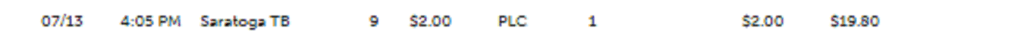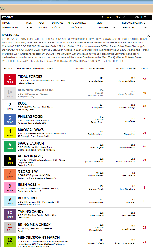 Both the Grey and Turf programs had good results yesterday at Saratoga and Gulfstream. In the 9th race at Saratoga yesterday, a $62.5K optional claiming race at 1 1/16 mi. on the turf, the Turf Program revealed some interesting data with the #1 horse, Tidal Wave, who was in post four. As the third selection with theoretical odds of 8-1, Tidal Forces projected strongly in E1 and E2 with win estimates of 41.7% and 44.4%. The horse also had a COMP of 27.8%, indicating that the horse projected with almost 2-1 strength on a component level in the simulation. The program revealed strength in the horse on a pure data level that was not observable in relating his final speed or win percentage data to the other horses. With that value, Tidal Wave was not a candidate for win but a strong candidate for place as the horse with the second strongest COMP in the field. In the race, Tidal Wave with Javier Castellano aboard made a nice move to the outside around the far turn to give himself running room and then accelerated down the stretch into second place before the wire, edging out the favorite, #8 Irish Aces at 1-1, who finished 3rd. Tidal Forces paid $19.80 for the place. The race illustrates how good things can happen when having faith in the program’s calculations.