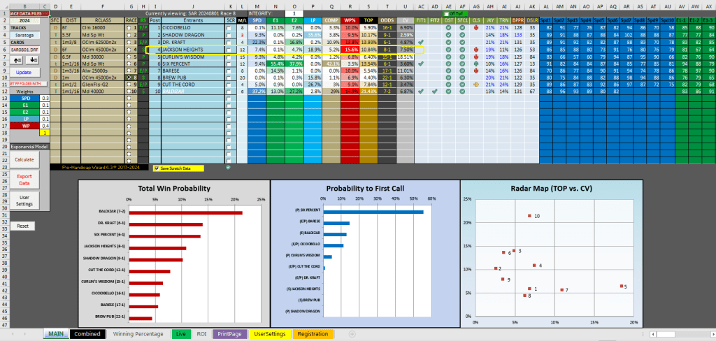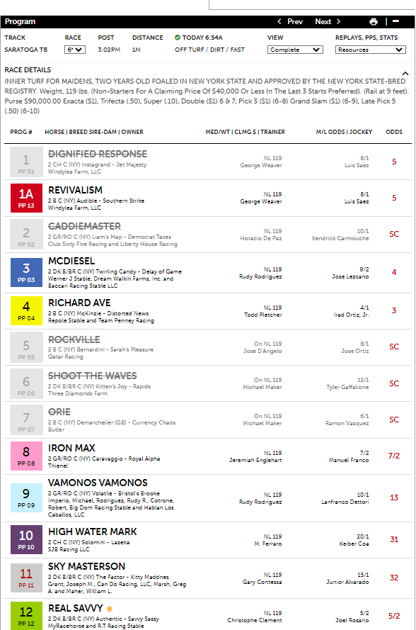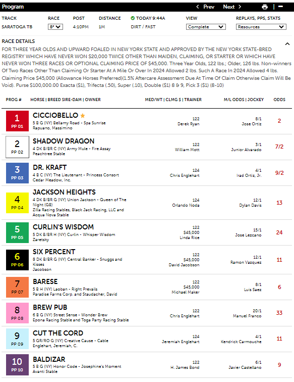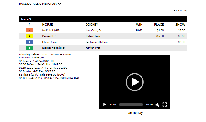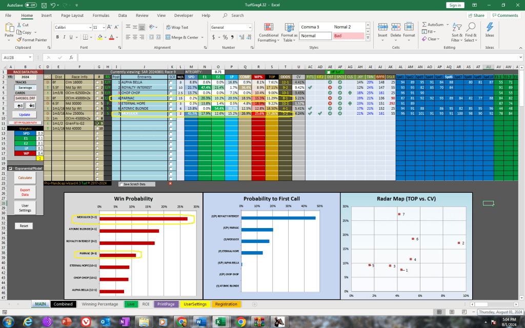 The program had some nice results today at Saratoga, including in the one graded stakes races in the 9th—the $250K G2 Glen Falls Stakes at 1 1/2 mi. on the turf for four-year olds fillies and mares—with #7 McKulick winning at 2-1. The Turf program had McKulick as its first selection with theoretical odds of 5-2. The horse projected first in final speed with a 41.5% win estimate (7-5 equivalent in odds) and had the highest win percentage at 25.6%. A horse that was extremely undervalued, #4 Parnac at 21-1, came in second. Parnac was a heavy overlay as a fourth selection with theoretical odds of 8-1, including having a 15.3% win percentage (6-1 equivalent in odds) and 18.5% COMP (9-2 equivalent in odds). McCulick paid $6.60 for the win and Parnac $16.20 for the place. McCulick won the same race a year ago.