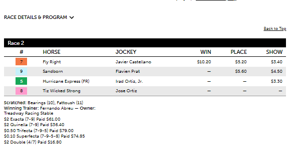 The Turf Program had another good result in the 6th race at Saratoga, a $35K OC at 1 mi. on the turf for three-year olds. The program had #5 Unleash the Power at 6-5 as its first selection, who had a total win probability of 42.42%, translating to theoretical odds of 8-5. The horse projected fairly dominantly in the final speed with a 61.8% win estimate while having a whopping 81.8% COMP value. In the race, Unleash the Power made a move to the outside around the far turn and accelerated down the stretch to get past #1 Gilded Cracken at 4-1, who had led most of the race. Unleash the Power paid $4.50 for the win.