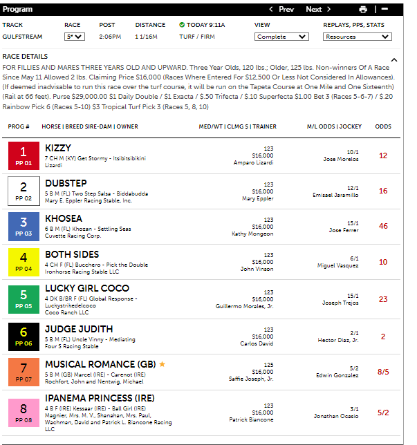 The Turf Program had a stellar result in the 5th race at Gulfstream today, a $16K claiming race at 1 1/16 mi. on the turf for three-year-olds. The first selection was #1 Kizzy at 12-1, who had a total winning probability of 25.51%, translating into theoretical odds of 3-1. The horse projected second in final speed with a 34.6% win estimate while having the third strongest win percentage at 18.6%. It worth nothing that he was in COMP with a value of 34.5% (2-1 equivalent strength in odds), indicating strength in the projections at the component level. In the race, Kizzy went wire to wire uncontested while the third selection, #7, Musical Romance finished 2nd. Kizzy paid $26.00 and the $1 exacta paid $47.80.