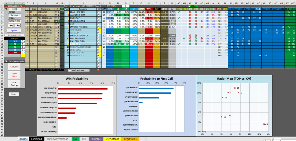 The Turf Program had a nice result in the 4th race at Saratoga today, a $40K claiming race at 5 1/2 f on the turf for three-year-old fillies and mares. The first selection was #12 Boss of All at 6-1 with a total win probability of 22.42%, translating into theoretical odds of 7-2. Hence, Boss of All was a substantial overlay, who projected strongly in E1 and E2 with win estimates of 38.3% and 34.2% along with having the highest win percentage in the field at 25.1%. This was a case of serious mispricing by the pool, where the class in the field in Boss of All not only was not getting odds to match her adjusted win percentage (3-1), she was being discounted at 6-1 even though she projected 2-1 strength in both E1 and E2 in a 5 1/2 f turf race. In the race, Boss of All stalked from off the pace and then gathered momentum around the far turn before accelerating down the stretch to win by three lengths. Boss of All paid $14.60 for the win. This race again shows the value of the Handicap Wizard and its calculations in identifying an undervalued favorite specific to the surface and distance.