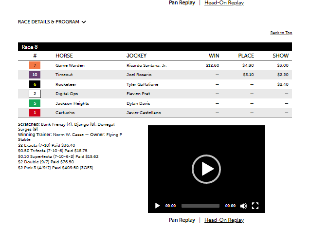 The Grey Program had another good result in the 8th at Saratoga, a $35K claiming race at 1 1/8 mi. on the dirt for three- and four-year olds. The first selection was #7 Game Warden at 5-1 with a total win probability of 33.09%, translating to theoretical odds of just under 2-1. The horse projected first in final speed with a 63.9% win estimate (3-5 strength in odds) and first in LP with a 65.4% along with having average risk with a Coefficient of Variance of 7.72%. In the race, Game Warden ran down #6 Rocketeer down the stretch, who had been leading early on. Game Warden showed his superior late kick as indicated in the high LP projection. The horse paid $12.60 for the win.