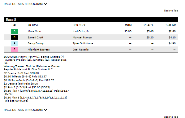 The Grey Program had a nice result today in the 5th at Saratoga, a $16K claming race at 1 mi. on the dirt for three-year-olds and up, having the exacta order with its first two selection of #5 More Vino at 3-2 and #6 Barrell Craft at 5-1. In the race, More Vino broke out to lead with Barrell Craft right behind him, and this is how it stayed to the finish. The $2 exacta, 5-6 , paid $28.80.