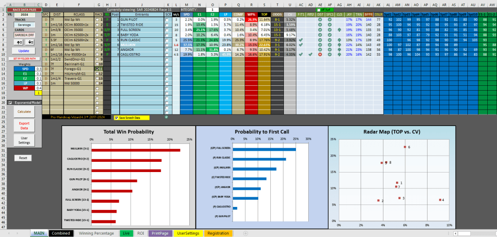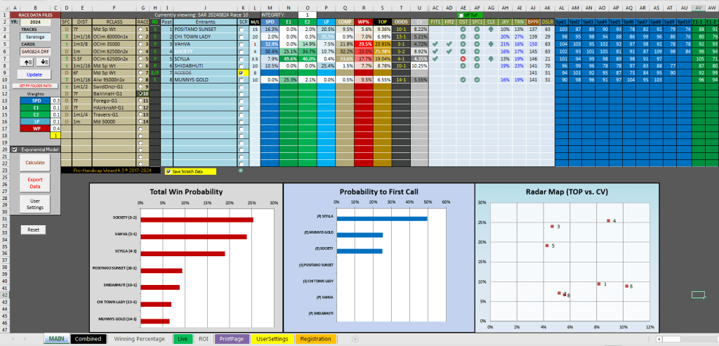 In the Travers Stakes at Saratoga today, #7 Fierceness was the upset winner at 7-2, who held off a late charging #1 Thorpedo Anna at 3-1 at the wire. The result was not surprising, as Fierceness had projected first in both SPD (36.1%) and COMP (39.6%) with 2-1 and 7-5 strength in both speed metrics. Fierceness theoretical odds of 3-1 made the horse a slight overlay at 7-2. Nor was it a surprise that #1 Thorpedo Anna came in 2nd, who had the second highest COMP at 28.8%. The order of finish followed the horses with the highest COMP values in descending order. It’s always positive to have 20% plus COMP values along with low CV values. With #2 Sierra Leonne at 8-5 (5-2 theoretical odds) coming in 3rd and #7 Dornoch 4th, the Grey Program had the tri-fecta with its first three selection boxed and the super-fecta with its first four selection boxed. Fierceness paid $9.80 and the $3.00 tri-fecta box (3 horses) paid $29.12.