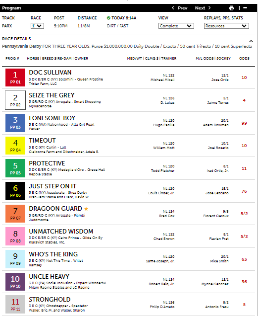 Today at Parx is the $1 mil. Pennslyvania Derby, run at 1 1/8 mi. on the dirt for three-year-olds. The race features Preakness Stakes winner, #3 Seize the Grey, West Virginia and Indiana Derby winner, #Dragoon Guard, Santa Anita Derby Winner, #11 Stronghold, and Withers Stakes winner, #10, Uncle Heavy. The program is favoring Seize the Grey as its first selection with a total win probability of 18.28%, translating into theoretical odds of 9-2—very close to where it is on the M/L at 5-1. Seize the Grey fell out of form in his last two starts in Jim Dandy and Belmont Stakes but won the Preakness Stakes, explaining his top-in-the-field 26.2% win percentage (3-1 equivalent in odds). The second selection is #1 Doc Sullivan with a total win probability of 16.86%, equating to theoretical odds of 9-2. Doc Sullivan projects second in final speed with a 26.0% win estimate (3-1 equivalent), a 62.3% estimate and a low risk with a Coefficient of Variance of 3.53%. The third selection is #5 Protective, who has a total win probability of 12.62%. Protective projects strength in E1 and E2 as well as COMP with values of 22.9%, 44.0% and 79.8%. The fourth selection is the M/L #7 Dragoon Guard with a total win probability of 11.6%. The horse is undefeated in his last five starts, including winning the West Virginia and Indiana Derbies in his last two. Dragoon Guard has the second highest win probability at 18.4% but projects fourth in final speed with a win estimate of 9.8%. In the final analysis, this is an open race with no horse having a total win probability of more than 20%. Seize the Grey seems a vulnerable first selection after having dropped out of form in his last races while Dragoon Guard as the M/L favorite projects weaker in final speed than Doc Sullivan, Timeout, Just Step On It. However, Dragoon Guard is in fine form after winning the West Virginia Derby handily over #11 Stronghold, finding an extra gear down the stretch. That said, it is fair to say that Dragoon Guard is better than he looks on paper in terms of his speed projections against the field. Projecting dominantly in late speed, #1 Doc Sullivan could surprise in this race given he 1 1/18 mi. distance after finishing second in the $250K Albany and $159K NY Derby in his last two starts. The final selections according to the program are #2 Seize the Grey, #1 Doc Sullivan, #5 Protective and #7 Dragoon Guard.