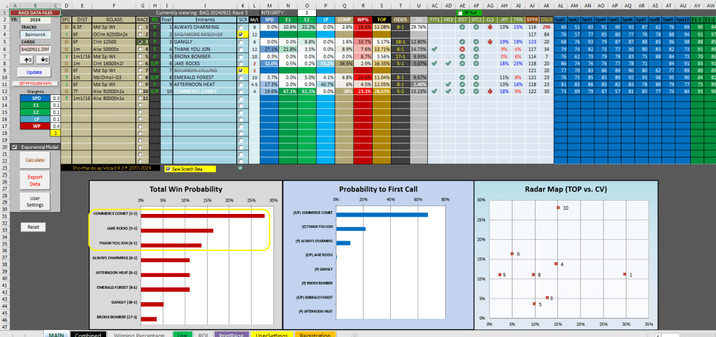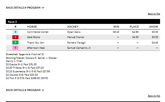 The Grey Program had an excellent result in the 3rd race at Belmont at Aqueduct, a $12.5K claiming race at 6f on the dirt for three-year-olds, having the correct order of the tri-fecta with its top three selections of #10 Commerce Comet at 3-1, #6 Jake Rocks at 5-2 and #4 Thank You John at 10-1. The $0.50 tri-fecta paid $37.25.