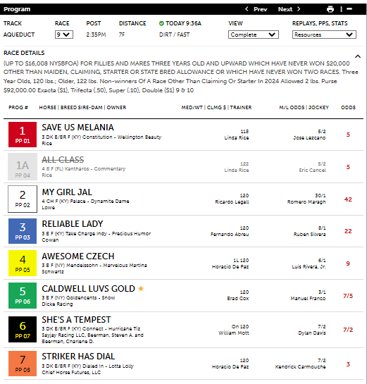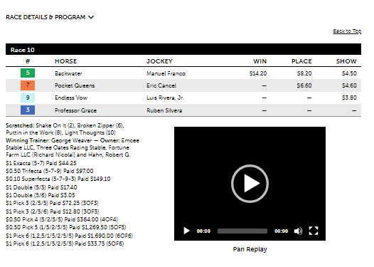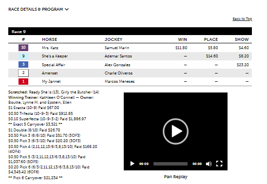 The program had a nice exacta result in the 4th race at Tampa today, a $8K claiming race at 1 1/16 mi. on the dirt for fillies and mares three-years-old and up, with its first two selections of #2 Humor Sense at 9-5 and #4 Shamu at 5-1. The $1 exacta paid $10.80. The program also had the tri-fecta orrder correct with #9 American Peaches as the third selection at 6-1. The $0.50 tri-fecta paid $21.50.