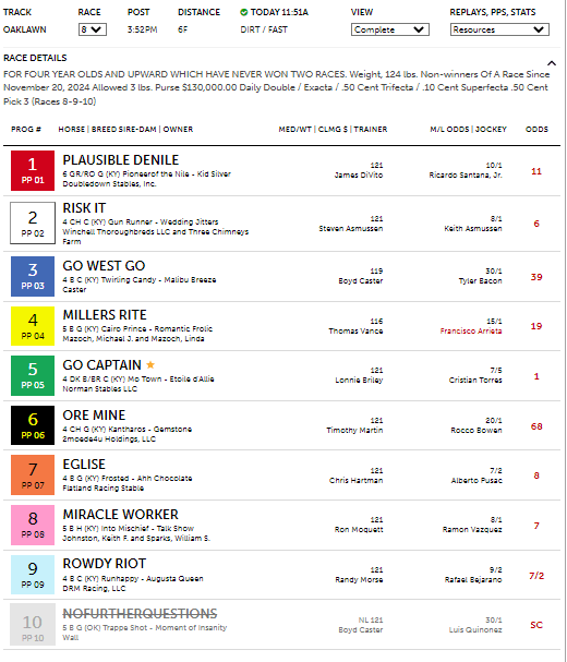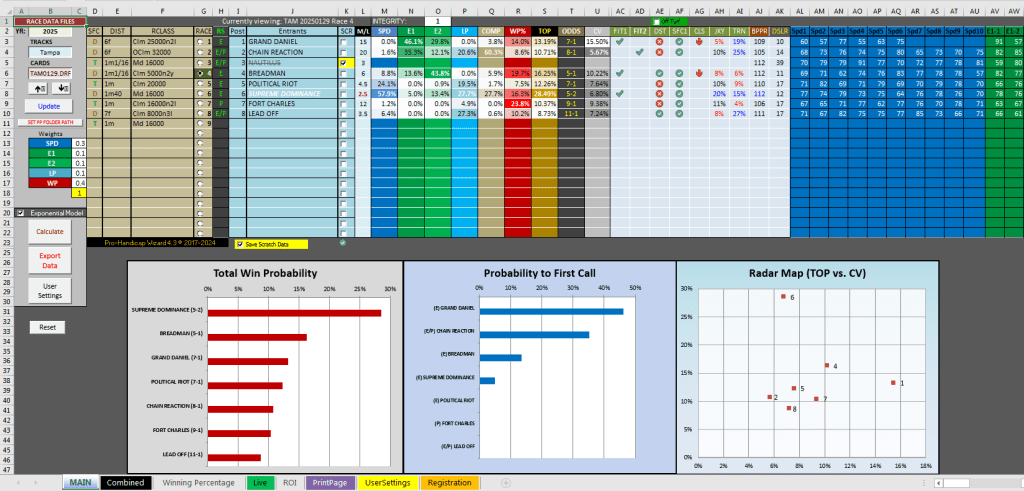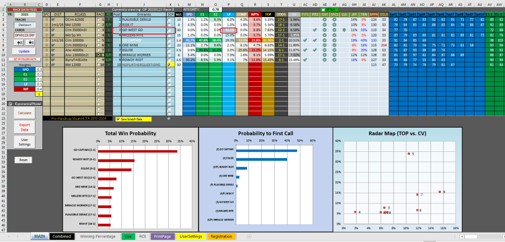 When it comes to winning with long shots, it’s often seen as an act of magic akin to pulling a rabbit out of a hat. One place with the Handicap Wizard to look for long shot prospects is in the LP projection, like in the 7th race at Oaklawn today, a $40K alw race at 6ft on the dirt for four-year-olds and up. The horse with the longest odds in this race was #3 Go West at 37-1, who had a total win probability of 7.83%, translating into odds of 12-1. However, the horse projected first in LP with a win estimate of 43.2% (about 7-5 strength), earning itself a FIT2 checkmark for its statistical superiority in that metric. In the race, this is exactly what happened with Go West turning on the afterburner down the stretch to come up for second at a big price, paying $27.40 for the place. Thanks to the Handicap Wizard’s projections, this user was able to see that late pace strength with the heavily discounted horse horse and take advantage of it.