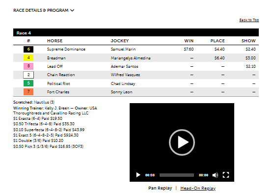 The Grey Program had a nice result today in the 4th at Tampa, a $5K claiming race at 1 1/16 mi. on the dirt for four-year-olds and up, with its first two selections of #6 Supreme Dominance at 5-2 and #4 Breadman at 5-1. That was the exacta order. In the race, Breadman led through much of the way but was caught late by #6 Supreme Dominance down the stretch. The $1 ex. paid $19.50.
