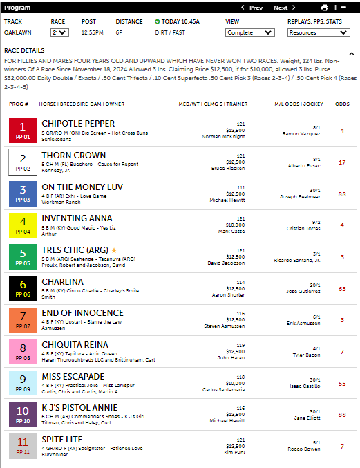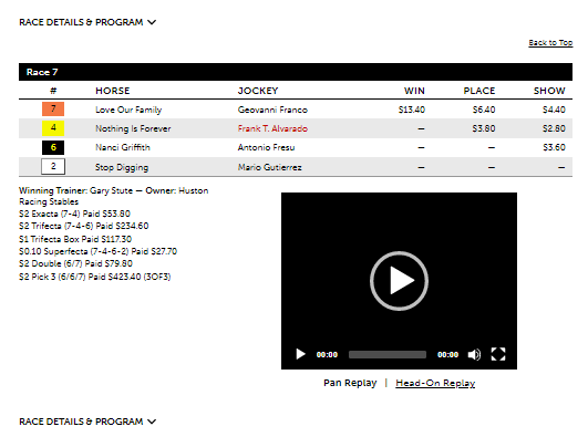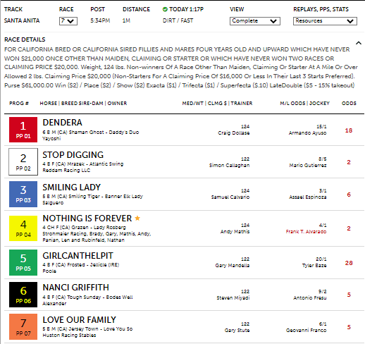 The program had an excellent result in the 2nd at Oaklawn today, a $12.K claiming race at 6ft on the dirt for fillies and mares four-year-old and up, with its first selection of #11 Spite Lite at 7-1. The horse had a total win probability of 21.15%, translating to odds of 7-2. Spite Lite projected 2nd in final speed with a 26.7% win estimate (about 3-1 strength) while having a 28.7% COMP (5-2 strength), a 15.2% win percentage and relative low risk with a Coefficient of Variance of 6.1%. In the race, Spite Lite went last to first while weaving through traffic out of the far turn into the stretch. The horse paid $16.80 for the win.