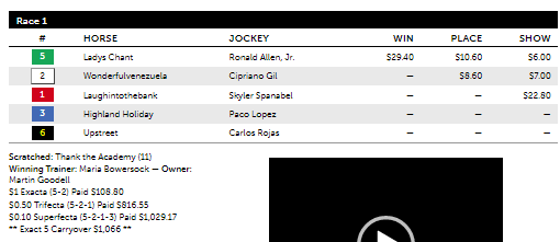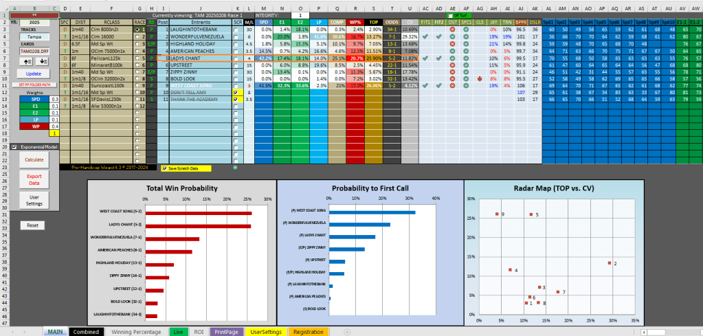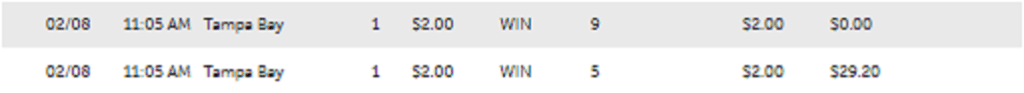 Race 2 at Tampa saw another result for the program, this time with #8 Mr. Crowley at 62-1, who had a total win probability of only 8.74% (10-1 theoretical odds) but high E2 and COMP values of 44.3% and 45.%. The latter signified that Mr. Crowley’s had about 6-5 strength with his components in the aggregate in the simulation. The winner, #6 Lamplighter Jack, had similar measures with the highest E1 and E2 values of 52.7% and 54.3% along with a 45.6%. Interestingly, the race went according to COMP with Lamplighter Jack finishing 1st at 15-1 and Mr. Crowley second at 62-1. The $1 exacta paid a whopping $827.20.
