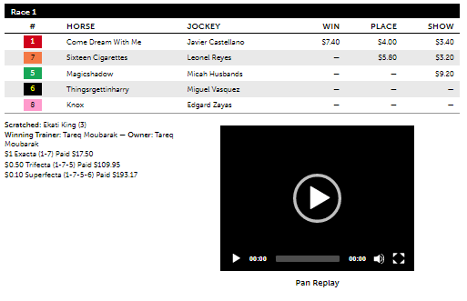 At Gulfstream, the program had the winner with its first selection of #1 Come Dream with me at 5-2. The horse had a total win probability of 30.58%, converting to odds of 2-1. Come Dream projected strong late speed with a LP win estimate of 42.3%, which he showed in the race down the stretch, as well as a high COMP value at 52.9% (4-5 equivalent strength on a component level in the simulation). Come Dream paid $7.40 for the win.